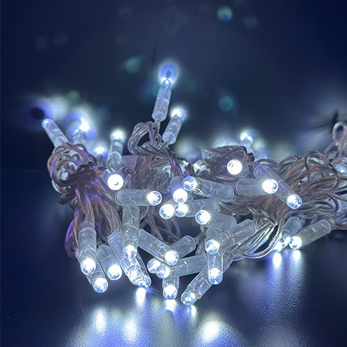 Гирлянд 31V: 50 бели LED /диодни/ лампички. Прозрачен PVC кабел, с конектор за свързване. Размер 5м, със свързващ кабел 0.30м Постоянен режим на светене. Без трансформатор. Външна и вътрешна употреба. 230V/24V/50Hz/3.6W/IP44 12/1