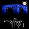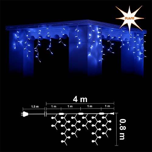 Висулка: 216 сини LED + 32 бели мигащи LED /диодни/ лампички. (Общо 248 LED) Бял каучуков кабел, Ф3.3мм2, с конектор за свързване. Размер 4м*0.8м. (4 сегмента по 1м., 32 броя висулки, 8 висулки на сегмент) Захранващ кабел 1.5м. Постоянен режим на светене. Външна употреба. Максимална дължина на системата при свързване 40м /до 10бр. х 4.0м. последователно свързани изделия от същия тип/ Максимална мощност на системата при свързване 185W /до 10бр. х 18.5W последователно свързани изделия от същия тип/ 220-230V/50Hz/18.5W/IP44 6/1