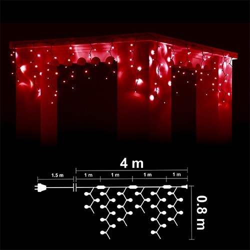Висулка: 152 червени LED /диодни/ лампички. Черен каучуков кабел, Ф3.3мм2, с конектор за свързване. Размер 4м*0.8м. (4 сегмента по 1м., 20 броя висулки, 5 висулки на сегмент) Захранващ кабел 1.5м. Постоянен режим на светене. Външна употреба. Максимална дължина на системата при свързване 40м /до 10бр. х 4.0м. последователно свързани изделия от същия тип/ Максимална мощност на системата при свързване 185W /до 10бр. х 18.5W последователно свързани изделия от същия тип/ 220-230V/50Hz/18.5W/IP44 6/1