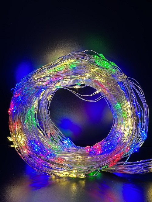 Каскада КУПЪР: 600 разноцветни LED микро /диодни/ лампички. Сребриста медна жичка. Размер 3.0м (20 броя висулки), захранващ кабел 1.5м, с GS трансформатор 6V/1А. Постоянен режим на светене. Външна и вътрешна употреба. 220-230V/50Hz/6W/IP44 3/4/1