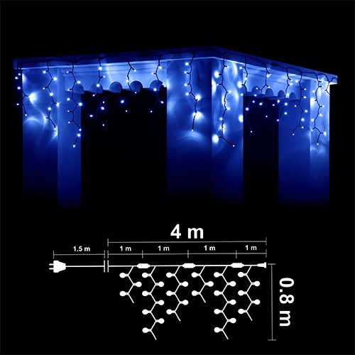 Висулка: 152 сини LED /диодни/ лампички. Черен каучуков кабел, Ф3.3мм2, с конектор за свързване. Размер 4м*0.8м. (4 сегмента по 1м., 20 броя висулки, 5 висулки на сегмент) Захранващ кабел 1.5м. Постоянен режим на светене. Външна употреба. Максимална дължина на системата при свързване 40м /до 10бр. х 4.0м. последователно свързани изделия от същия тип/ Максимална мощност на системата при свързване 185W /до 10бр. х 18.5W последователно свързани изделия от същия тип/ 220-230V/50Hz/18.5W/IP44 6/1