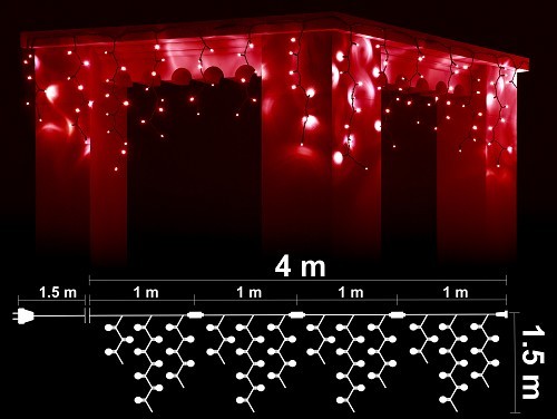 Висулка: 304 червени LED /диодни/ лампички. Черен каучуков кабел, Ф3.3мм2, с конектор за свързване. Размер 4м*1.5м. (4 сегмента по 1м., 40 броя висулки, 10 висулки на сегмент) Захранващ кабел 1.5м. Постоянен режим на светене. Външна употреба. Максимална дължина на системата при свързване 80м /до 20бр. х 4.0м. последователно свързани изделия от същия тип/ Максимална мощност на системата при свързване 280W /до 20бр. х 14W последователно свързани изделия от същия тип/ 220-230V/50Hz/14W/IP44 6/1