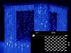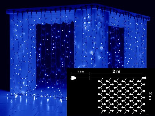 Завеса: 400 сини 5мм LED /диодни/ лампички. Черен кабел, Ф...мм2, с конектор за свързване. Размер 2м*2м, (20 броя висулки) захранващ кабел 1.5м. Контролер за промяна режима на светене с 8 функции. Максимална дължина на системата при свързване 20м /до 10бр. х 2.0м. последователно свързани изделия от същия тип/ Максимална мощност на системата при свързване 720W /до 10бр. х 72W последователно свързани изделия от същия тип/ Вътрешна употреба. 220-230V/50Hz/72W/IP20 2/1