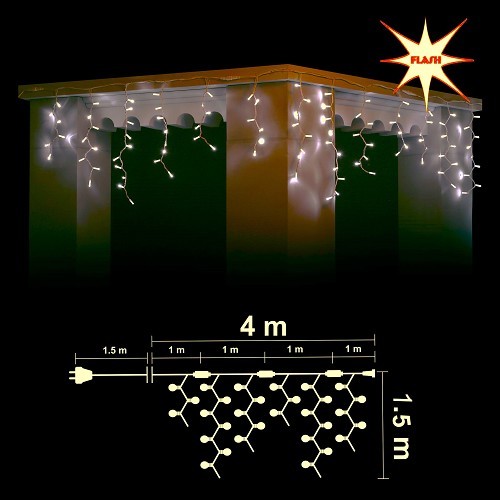 Висулка: 264 топло бели 2700K LED + 40 бели мигащи LED /диодни/ лампички. (Общо 304 LED) Бял каучуков кабел, Ф3.3мм2, с конектор за свързване. Размер 4м*1.5м. (4 сегмента по 1м., 40 броя висулки, 10 висулки на сегмент) Захранващ кабел 1.5м. Постоянен режим на светене. Външна употреба. Максимална дължина на системата при свързване 80м /до 20бр. х 4.0м. последователно свързани изделия от същия тип/ Максимална мощност на системата при свързване 280W /до 20бр. х 14W последователно свързани изделия от същия тип/ 220-230V/50Hz/14W/IP44 6/1