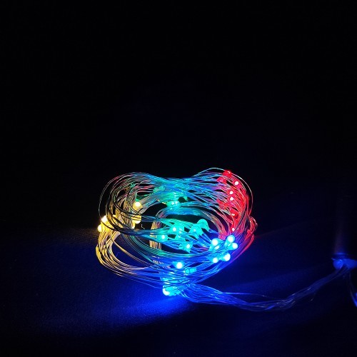 Каскада КУПЪР: 60 разноцветни LED микро /диодни/ лампички. Сребриста медна жичка. Размер 0.6м (10 броя висулки), захранващ кабел 1.5м, с GS трансформатор 6V/1А. Постоянен режим на светене. Външна и вътрешна употреба. 220-230V/50Hz/3.5W/IP44 3/6/1