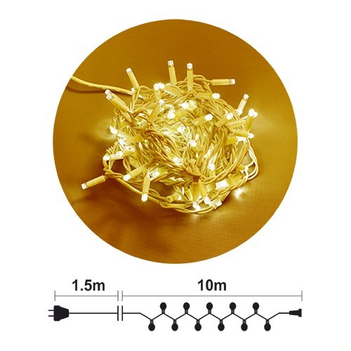 Гирлянд: 100 жълти LED /диодни/ лампички. Бял каучуков кабел, Ф3.3мм2, с конектор за свързване. Размер 10м. Захранващ кабел 1.5м. Постоянен режим на светене. Външна употреба. Максимална дължина на системата при свързване 200м /до 20бр. х 10м. последователно свързани изделия от същия тип/ Максимална мощност на системата при свързване 176W /до 20бр. х 8.8W последователно свързани изделия от същия тип/ 220-230V/50Hz/8.8W/IP44 12/1