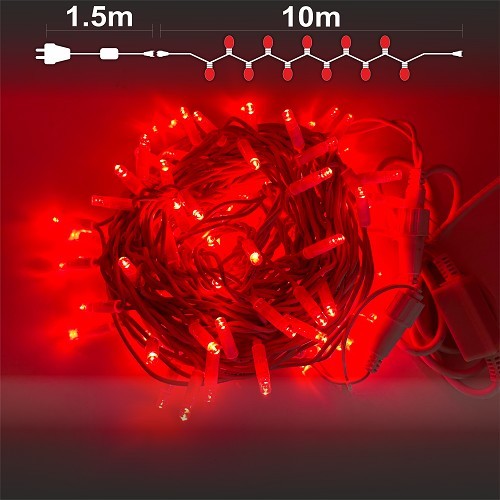 Гирлянд: 100 червени LED /диодни/ лампички. Бял каучуков кабел, Ф3.3мм2, с конектор за свързване. Размер 10м. Захранващ кабел 1.5м. /ET560B-20 или ET560W-20/ Постоянен режим на светене. Външна и вътрешна употреба. Максимална дължина на системата при свързване 200м /до 20бр. х 10м. последователно свързани изделия от същия тип/ Максимална мощност на системата при свързване 176W /до 20бр. х 8.8W последователно свързани изделия от същия тип/ /ако използваният от вас захранващ кабел позволява/ 220-230V/50Hz/8.8W/IP44 12/1