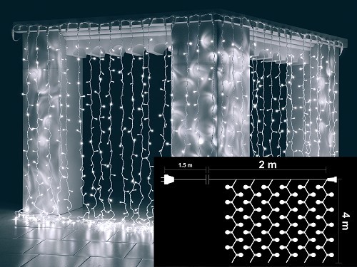 Завеса: 800 бели 5мм LED /диодни/ лампички. Бял кабел, Ф...мм2, с конектор за свързване. Размер 2м*4м, (20 броя висулки) захранващ кабел 1.5м. Контролер за промяна режима на светене с 8 функции. Максимална дължина на системата при свързване 12м /до 6бр. х 2.0м. последователно свързани изделия от същия тип/ Максимална мощност на системата при свързване 432W /до 6бр. х 72W последователно свързани изделия от същия тип/ Вътрешна употреба. 220-230V/50Hz/72W/IP20 2/1
