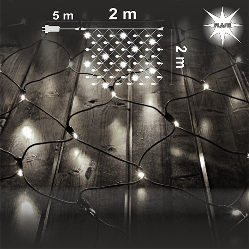 Мрежа: 360 бели LED /диодни/ лампички + 40 бели мигащи LED лампички. (Общо 400 LED) Черен PVC кабел, с конектор за свързване. Размер 2*2м. Захранващ кабел 5м с трансформатор 31V. Постоянен режим на светене. Външна и вътрешна употреба. Максимална дължина на системата при свързване 6м /до 3бр. х 2м. последователно свързани изделия от същия тип/ Максимална мощност на системата при свързване 24W /до 3бр. х 8W последователно свързани изделия от същия тип/ 220-230V/50Hz/8W/IP44 6/1