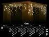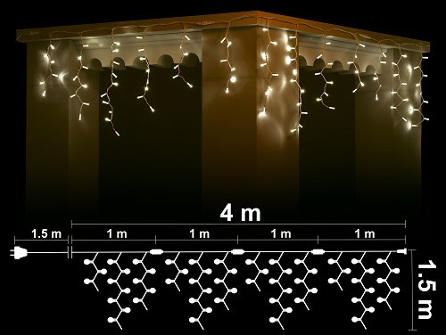 Висулка: 304 топло бели 2700K LED /диодни/ лампички. Бял каучуков кабел, Ф3.3мм2, с конектор за свързване. Размер 4м*1.5м. (4 сегмента по 1м., 40 броя висулки, 10 висулки на сегмент) Захранващ кабел 1.5м. Постоянен режим на светене. Външна употреба. Максимална дължина на системата при свързване 80м /до 20бр. х 4.0м. последователно свързани изделия от същия тип/ Максимална мощност на системата при свързване 280W /до 20бр. х 14W последователно свързани изделия от същия тип/ 220-230V/50Hz/14W/IP44 6/1