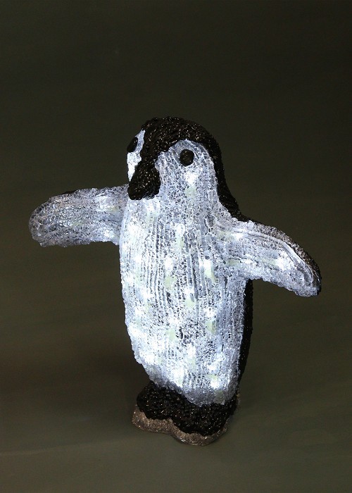 Пингвин черно-бял - акрилна фигура Размер H38см, 32 бели LED /диодни/ лампички. Захранващ кабел 1.5м, с трансформатор. Постоянен режим на светене. Вътрешна употреба. 220-230V/50Hz/2.5W/IP20
