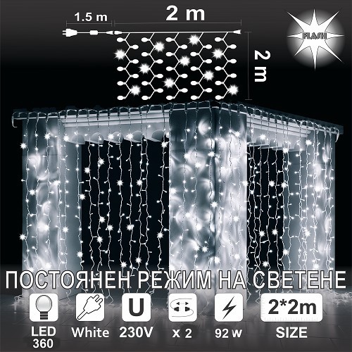 Завеса: 324 бели LED + 36 бели мигащи LED /диодни/ лампички. (Общо 360 LED) Бял каучуков кабел, Ф3.3мм2, с конектор за свързване. Размер 2м*2м. (20 броя висулки) (всяка висулка с 4 бели мигащи LED /диодни/ лампички /разпръснати/) Захранващ кабел 1.5м. Постоянен режим на светене. Външна употреба. Максимална дължина на системата при свързване 4м /до 2бр. х 2.0м. последователно свързани изделия от същия тип/ Максимална мощност на системата при свързване 184W /до 2бр. х 92W последователно свързани изделия от същия тип/ 220-230V/50Hz/92W/IP44 6/1