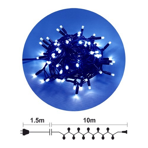 Гирлянд: 90 сини LED + 10 бели мигащи LED /диодни/ лампички. (Общо 100 LED) Черен каучуков кабел, Ф3.3мм2, с конектор за свързване. Размер 10м. Захранващ кабел 1.5м. /ET560B-20 или ET560W-20/ Постоянен режим на светене. Външна употреба. Максимална дължина на системата при свързване 200м /до 20бр. х 10м. последователно свързани изделия от същия тип/ Максимална мощност на системата при свързване 176W /до 20бр. х 8.8W последователно свързани изделия от същия тип/ /ако използваният от вас захранващ кабел позволява/ 220-230V/50Hz/8.8W/IP44 12/1