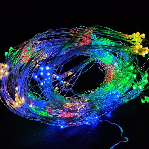 Каскада КУПЪР: 400 разноцветни LED микро /диодни/ лампички. Сребриста медна жичка. Размер 2.0м (20 броя висулки), захранващ кабел 1.5м, с GS трансформатор 6V/1А. Постоянен режим на светене. Външна и вътрешна употреба. 220-230V/50Hz/3.5W/IP44 3/4/1